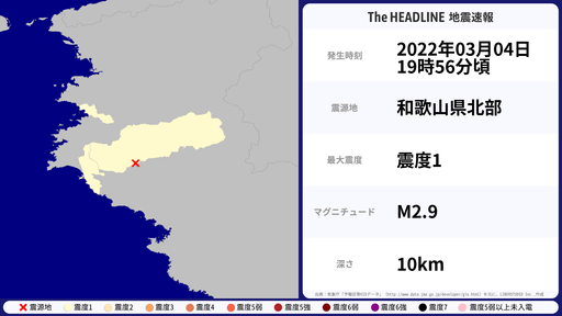 3月4日19時56分頃、和歌山県で最大震度1を観測する地震がありました。