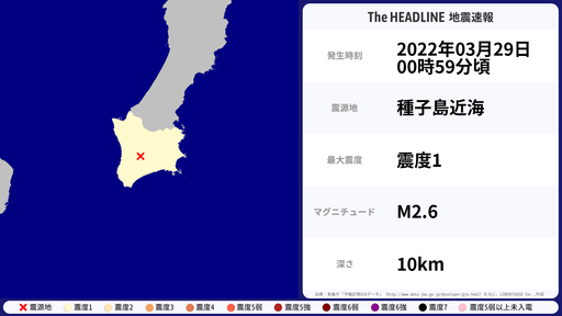 3月29日00時59分頃、鹿児島県で最大震度1を観測する地震がありました。