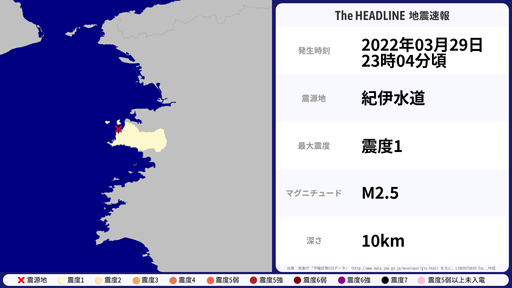 3月29日23時04分頃、和歌山県で最大震度1を観測する地震がありました。