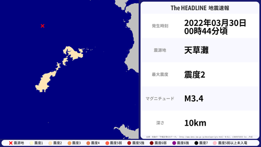 3月30日00時44分頃、鹿児島県で最大震度2を観測する地震がありました。