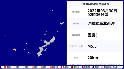 3月30日02時36分頃、沖縄県で最大震度3を観測する地震がありました。