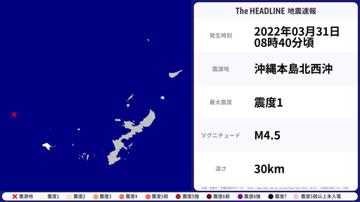 3月31日08時40分頃、沖縄県で最大震度1を観測する地震がありました。