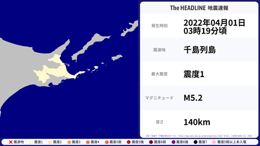 4月1日03時20分頃、北海道で最大震度1を観測する地震がありました。