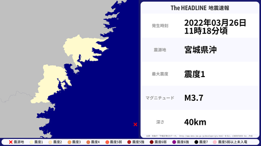 3月27日22時06分頃、宮城県などで最大震度1を観測する地震がありました。