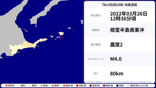 3月26日12時36分頃、北海道で最大震度2を観測する地震がありました。