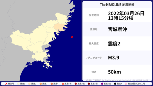 3月27日22時54分頃、宮城県などで最大震度3を観測する地震がありました。