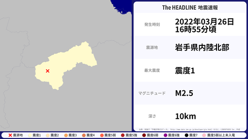 3月26日16時55分頃、岩手県で最大震度1を観測する地震がありました。