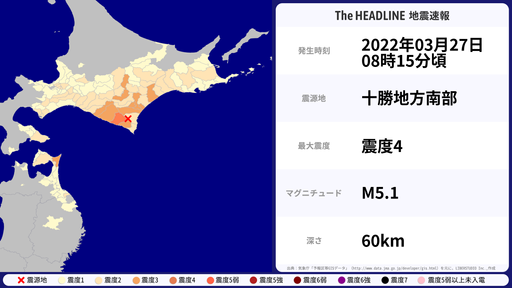 3月27日08時15分頃、北海道で最大震度4を観測する地震がありました。