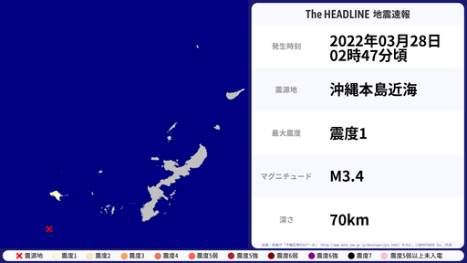 3月28日02時47分頃、沖縄県で最大震度1を観測する地震がありました。