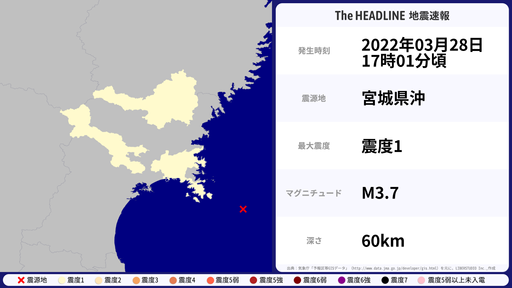 3月27日19時34分頃、宮城県などで最大震度1を観測する地震がありました。