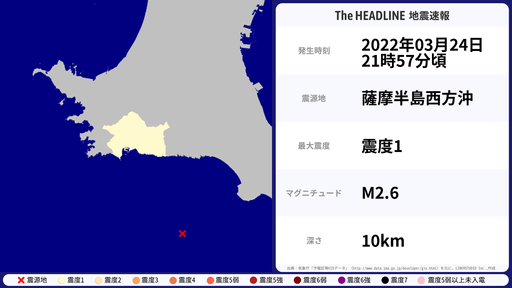 3月24日21時57分頃、鹿児島県で最大震度1を観測する地震がありました。