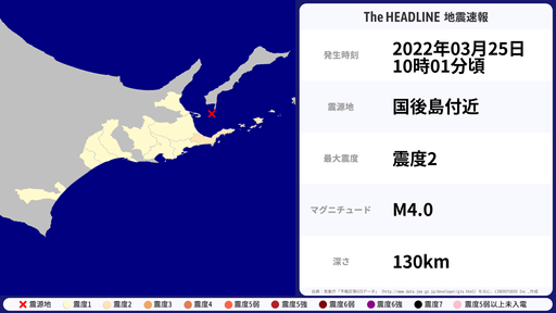 3月25日10時01分頃、北海道で最大震度2を観測する地震がありました。