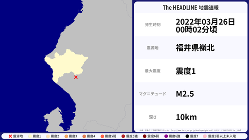 3月26日00時02分頃、福井県で最大震度1を観測する地震がありました。
