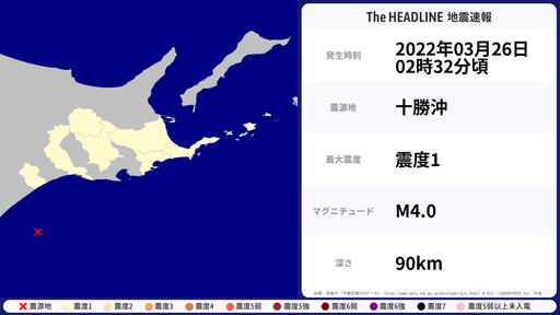 3月26日02時32分頃、北海道で最大震度1を観測する地震がありました。