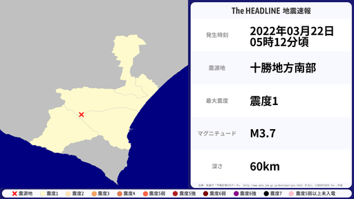 3月22日05時12分頃、北海道で最大震度1を観測する地震がありました。