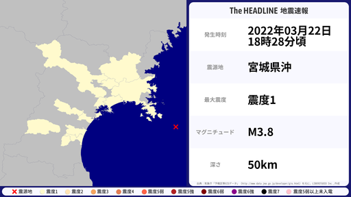 3月22日18時28分頃、宮城県で最大震度1を観測する地震がありました。