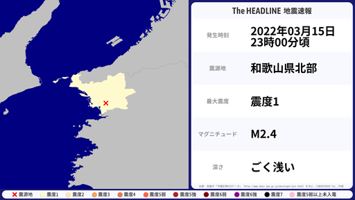 3月15日23時00分頃、和歌山県で最大震度1を観測する地震がありました。