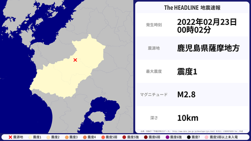 2月23日00時02分頃、鹿児島県で最大震度1を観測する地震がありました。
