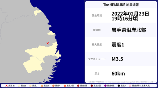 2月23日19時16分頃、青森県などで最大震度1を観測する地震がありました。