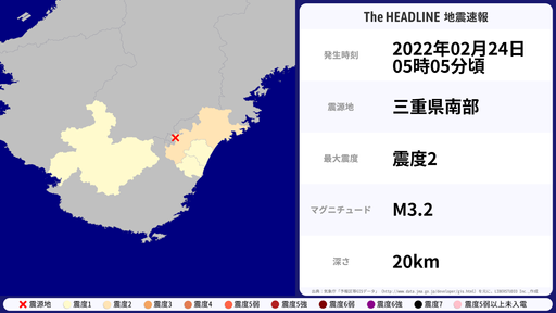 2月24日05時05分頃、三重県で最大震度2を観測する地震がありました。