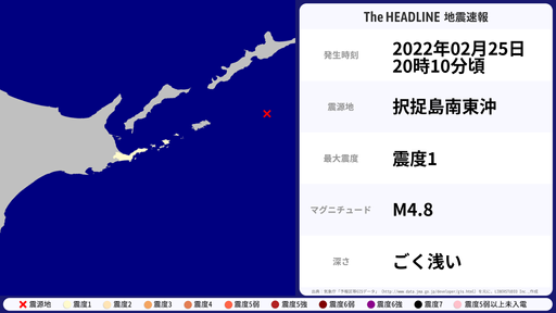 2月25日20時10分頃、北海道で最大震度1を観測する地震がありました。