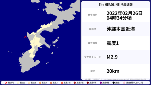 2月26日04時34分頃、沖縄県で最大震度1を観測する地震がありました。