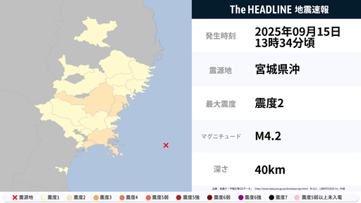 9月15日13時34分頃、岩手県・宮城県で最大震度2の地震を観測