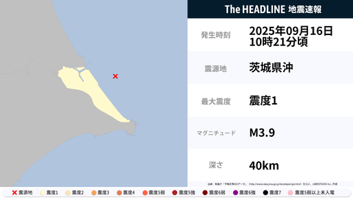9月16日10時21分頃、茨城県で最大震度1の地震を観測