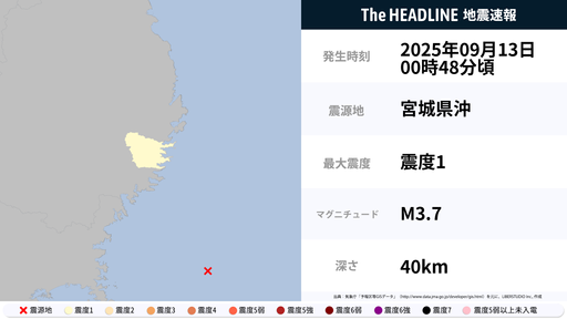 9月13日0時48分頃、岩手県で最大震度1の地震を観測