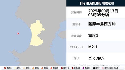 9月13日3時9分頃、鹿児島県で最大震度1の地震を観測