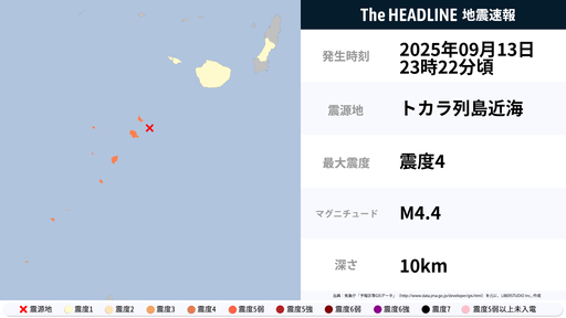 9月13日23時22分頃、鹿児島県で最大震度4の地震を観測