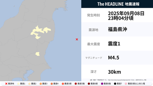 9月8日23時4分頃、福島県・茨城県で最大震度1の地震を観測