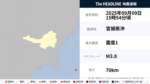 9月11日1時49分頃、宮城県・福島県などで最大震度1の地震を観測