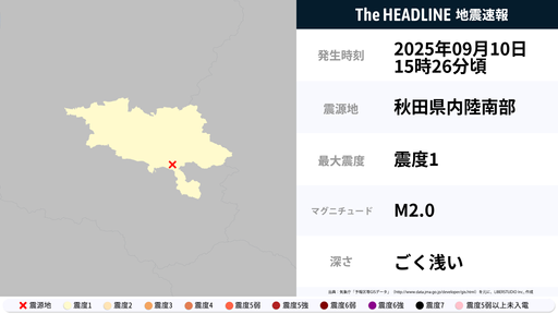 9月10日15時26分頃、秋田県で最大震度1の地震を観測
