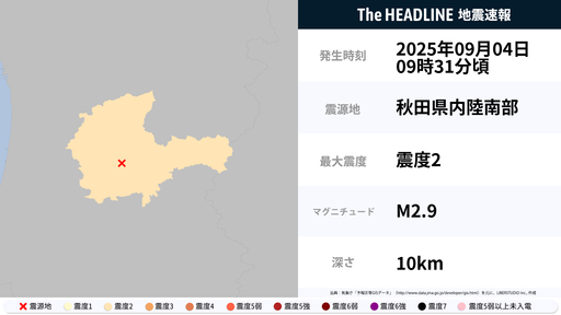 9月4日9時31分頃、秋田県で最大震度2の地震を観測