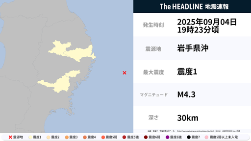 9月4日19時24分頃、岩手県で最大震度1の地震を観測