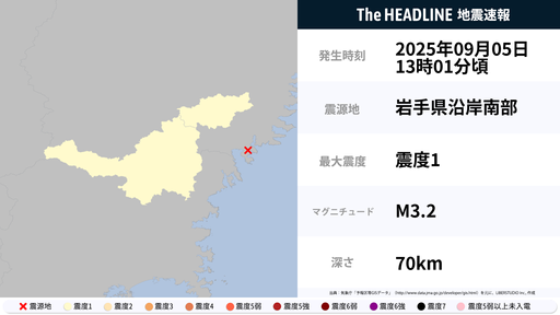 9月5日13時1分頃、岩手県で最大震度1の地震を観測