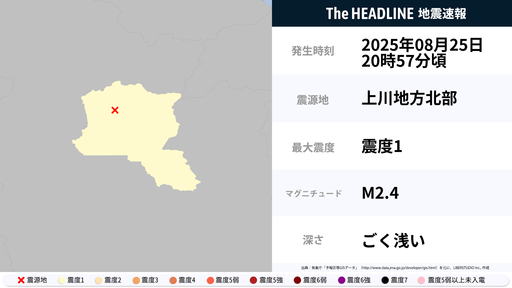 8月25日20時57分頃、北海道で最大震度1の地震を観測