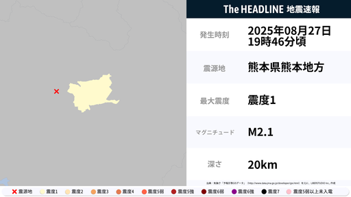 8月27日19時46分頃、熊本県で最大震度1の地震を観測