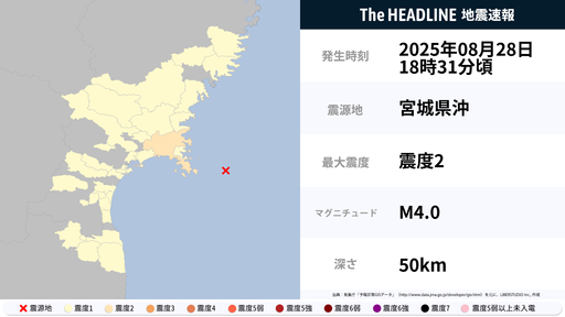8月28日18時31分頃、宮城県で最大震度2の地震を観測
