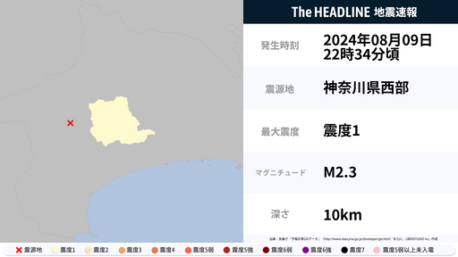 8月9日22時34分頃、神奈川県で最大震度1の地震を観測