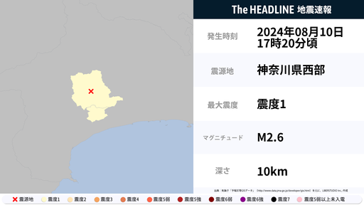 8月10日17時20分頃、神奈川県で最大震度1の地震を観測