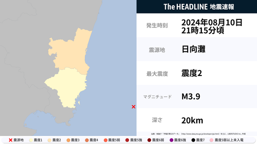 8月10日21時16分頃、宮崎県で最大震度2の地震を観測