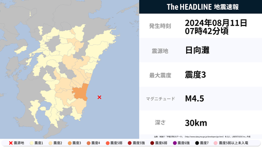 8月11日7時42分頃、宮崎県で最大震度3の地震を観測