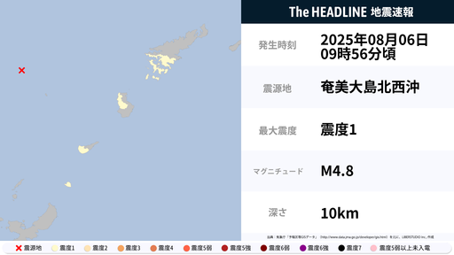 8月6日9時56分頃、鹿児島県で最大震度1の地震を観測
