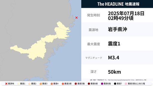 7月18日2時49分頃、岩手県で最大震度1の地震を観測