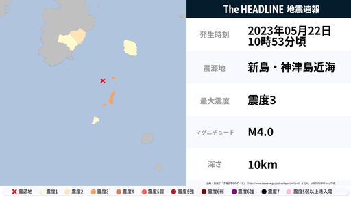 5月22日10時53分頃、東京都で最大震度3の地震を観測