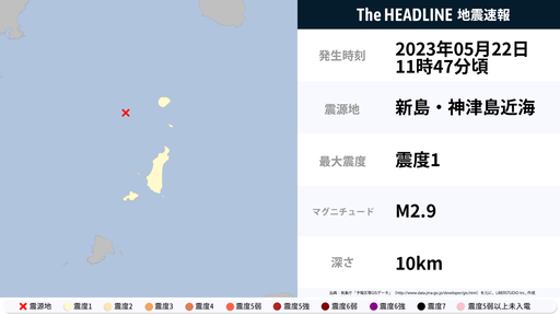 5月22日11時47分頃、東京都で最大震度1の地震を観測