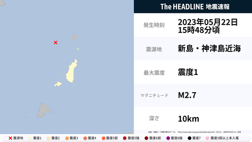 5月22日15時48分頃、東京都で最大震度1の地震を観測