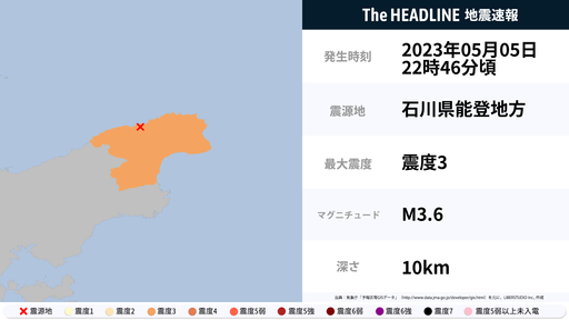 5月5日22時46分頃、石川県で最大震度3の地震を観測
